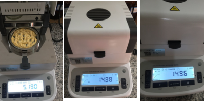 測試樣品2:為了檢測儀器的精確性,待儀器溫度降至50℃以下時進行第二次測試,用實驗勺提取5.5克飼料,置于不銹鋼托盤中,用實驗藥勺將飼料平鋪均勻,溫度設(shè)置135℃用儀器進行加熱,約15分鐘后檢測結(jié)束,檢測數(shù)據(jù)顯示14.88%;