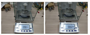 - 將2號(hào)陶瓷材料置于稱重臺(tái)上,屏幕出現(xiàn)空氣中2號(hào)陶瓷材料的重量為0.9031,按MODE鍵,就記錄了陶瓷材料在空氣中的重量了。
