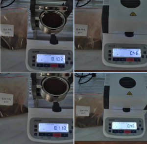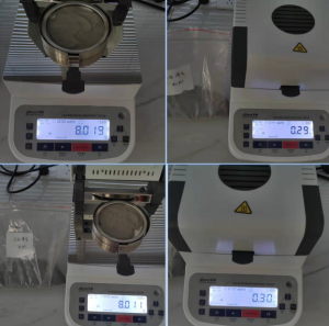 1、測試陶瓷粉末:為了使測試過程中將陶瓷粉末烘干烘透,我們將陶瓷粉末分散開來,以便溫度能滲透進(jìn)陶瓷粉末內(nèi)部。取8克多陶瓷粉末撒于不銹鋼托盤中,用鑷子將陶瓷粉末平鋪均勻,為使陶瓷粉末經(jīng)過高溫度加熱后能夠徹底烘干,我們將溫度設(shè)置在105℃,按“START”鍵開始測試,1分鐘37秒后檢測結(jié)束,檢測數(shù)據(jù)顯示0.30%;