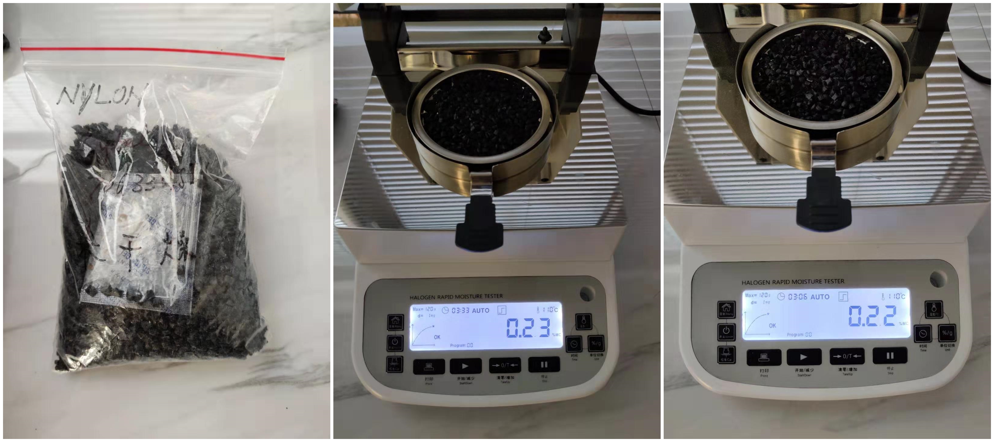 - 重復(fù)步驟3/4,測試未烘干的尼龍顆粒水分分別為0.23%、0.22%。