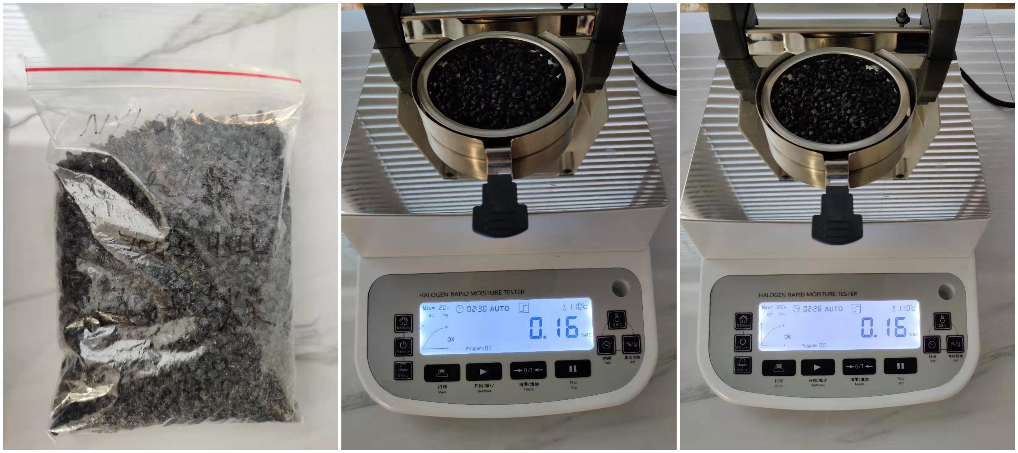 - 復(fù)位儀器,待儀器冷卻至40℃以下后,再取15g左右已烘干尼龍顆粒均勻鋪在樣品盤上,重復(fù)上述測試步驟;測試結(jié)束后得出第二組數(shù)據(jù),顯示樣品的水分含量為0.16%;結(jié)果可靠,可重復(fù)性好。