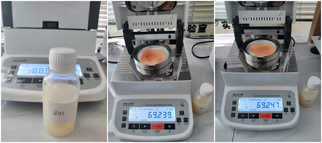 5、復(fù)位儀器,待儀器冷卻至40℃以下后,再取等量的溶液1均勻滴在玻璃纖維紙上,重復(fù)上述測(cè)試步驟;測(cè)試結(jié)束后得出第二組數(shù)據(jù),顯示樣品的揮發(fā)物為69.247%,固含量為30.753%;兩次測(cè)試誤差為0.008%,表示測(cè)試結(jié)果可靠,可重復(fù)性好。