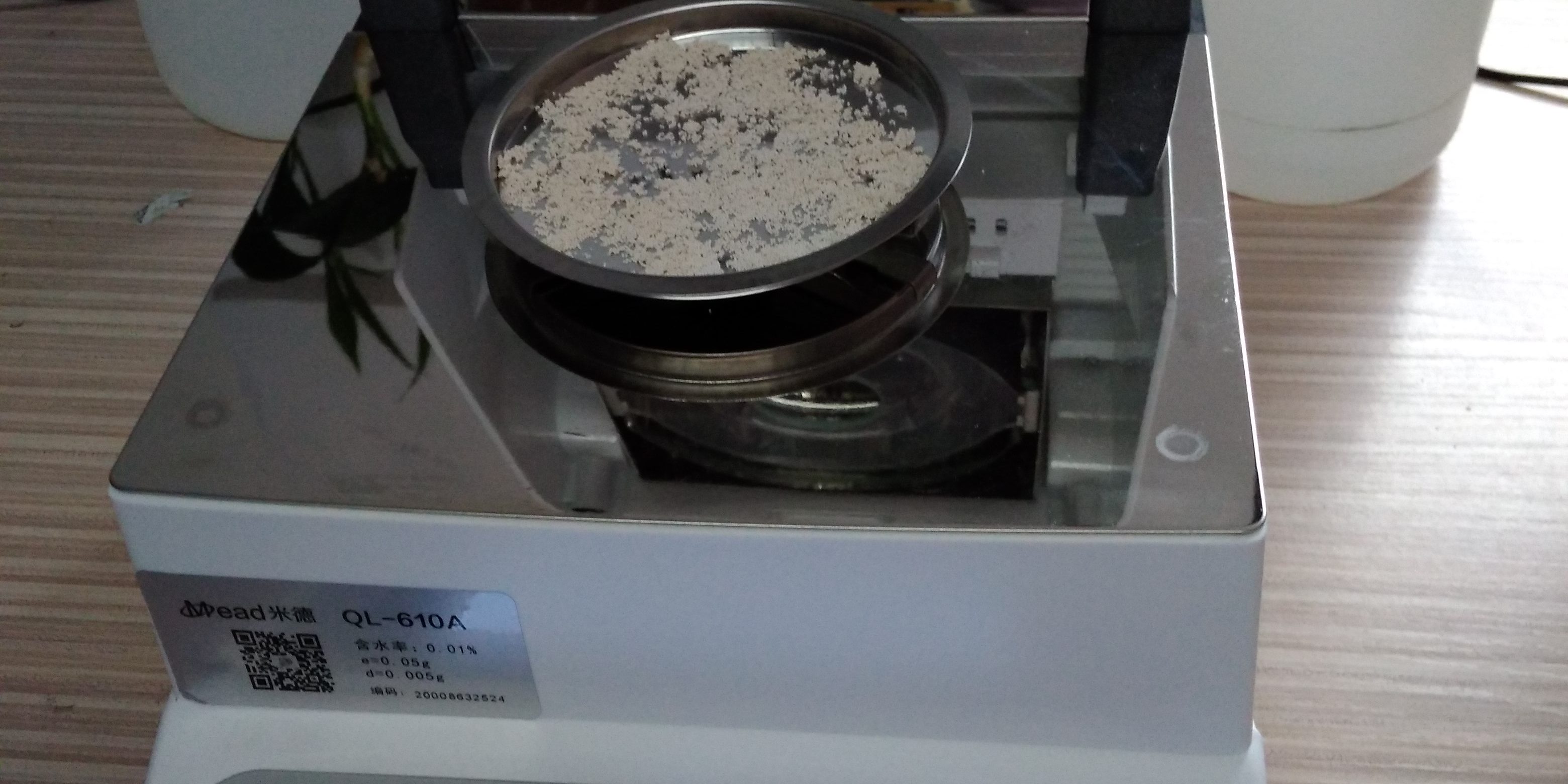 - 為了得到更精確穩(wěn)定的數(shù)據(jù)結(jié)果,在進(jìn)行第二次測試過程前先等待樹脂水分儀降溫,待儀器本身溫度降至40度以下時,同樣取4克左右樹脂料顆粒于不銹鋼托盤中,將樹脂顆粒平鋪均勻,這次我們把溫度設(shè)定在105℃,按“START”鍵開始測試,14分43 秒后檢測結(jié)束,檢測數(shù)據(jù)顯示56.51%;