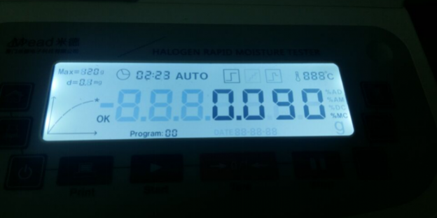 測試樣品1:為了檢測儀器的精確性,待儀器溫度降至30℃(常溫)以下時進(jìn)行第二次測量,用藥匙取樣10-12g,用藥匙取樣10-12g纖維紙上,溫度設(shè)置85℃用儀器進(jìn)行加熱,約3分鐘后檢測結(jié)束,檢測數(shù)據(jù)顯示0.090%;