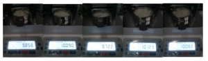 2.將防風(fēng)盤、支架、樣品盤一一裝好,接通電源,按下開機(jī)鍵,顯示屏進(jìn)入開機(jī)界面,首先按去皮鍵減去樣品盤重量,后將100g砝碼放入托盤進(jìn)行校準(zhǔn);