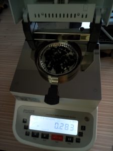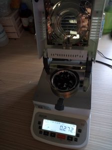 為了使測試過程中電池粉末水分儀將電池粉末烘干烘透,我們將電池粉末分散開來,以便溫度能滲透進電池粉末內(nèi)部。取7克多電池粉末撒于不銹鋼托盤中,用鑷子將電池粉末平鋪均勻,為避免電池粉末經(jīng)過高溫度加熱后變性,我們將溫度設置在140℃,按“START”鍵開始測試,2分10秒后檢測結(jié)束,檢測數(shù)據(jù)顯示272%;
